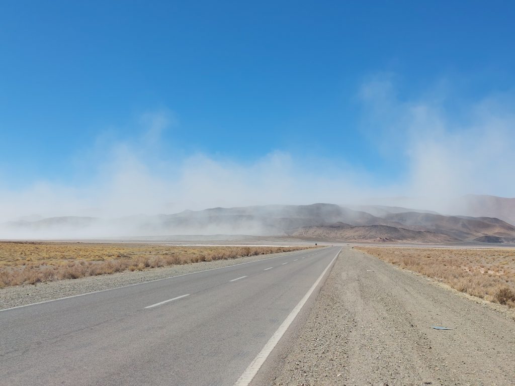 Mit viel Rückenwind kamen wir an diesem Morgen wieder super voran. An einem windgeschützten Platz machten wir Mittagsrast. In der Ferne sahen wir allerdings grosse Staubwolken. Als wir weiterfahren wollten, stoppte ein Lastwagenfahrer und meinte, wir könnten auf keinen Fall weiterfahren. Mit dem Velo sei es viel zu gefährlich durch den Sandsturm zu fahren.