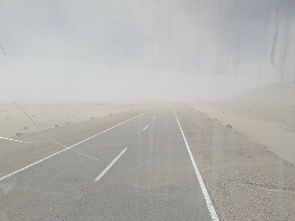 Die Sicht wurde mit jedem Kilometer schlechter und es lagen zum Teil bis zu 20 cm Sand auf der Strasse. Leider gab es auch einen Auffahrunfall mit PW und Lastwagen. Mit dem Fahrrad in so einen Sturm zu geraten, wäre verheerend gewesen.