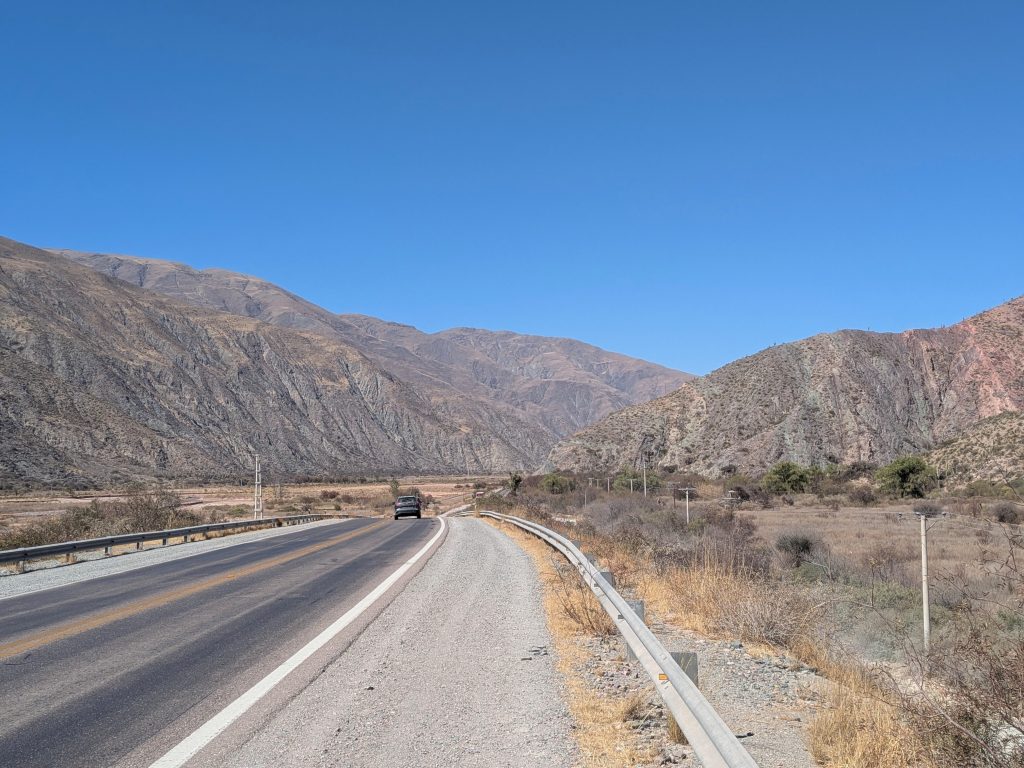 Von San Salvador de Jujuy nach Salta wollten wir wegen dem Verkehr nicht auf der Hauptstrasse fahren. Die ersten 30 Kilometer unserer Route verliefen auf guten Naturstrassen und wir kamen (trotz Plattfuss von Nik 😳) gut voran. Danach wurde die Strasse zunehmend schlechter. Das Weiterfahren wurde recht ruppig und wir kamen nur noch langsam voran.